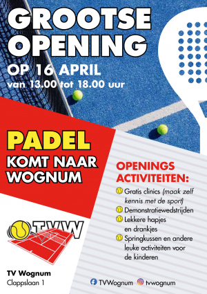 Tot die tijd kunnen de banen wel al gebruikt worden door leden van TV Wognum, en er kan ook worden afgehangen. Doe dit dus wanneer je zeker wilt zijn om te kunnen spelen.